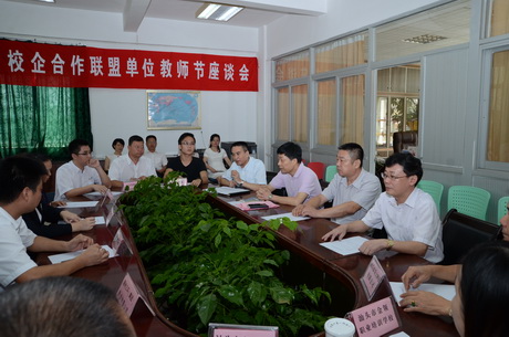 会上,中国联通汕头分公司、汕头花园酒店管理有限公司、汕头市新东方酒店用品有限公司、汕头市大豪汽车零部件实业有限公司等联盟单位代表向学校教师致以节日的祝贺。与会领导、代表围绕“新学年如何进一步发挥校企合作联盟的职能、同步规划职业教育与企业发展、协调推进人力资源开发与技术进步、推动学校教育教学改革与产业转型升级衔接配套、突出学校办学特色、强化校企协同育人、建立校企合作联盟制度”等问题进行了深入研讨,提出了不少建设性的建议和方案。校长陈庭照代表学校对联盟单位代表一行来校座谈交流表示欢迎,指出双方的合作具有历史渊源和深厚基础,希望双方通过共建校企合作联盟这个契机,扎实推进务实合作,促进优势互补,实现共同发展。并就如何完善校企合作联盟机制,现实校企合作规范化、常态化、制度化,增强校企双方责任感、进一步推动校企深度融合、开展技术合作等问题与联盟单位代表进行互动交流。
